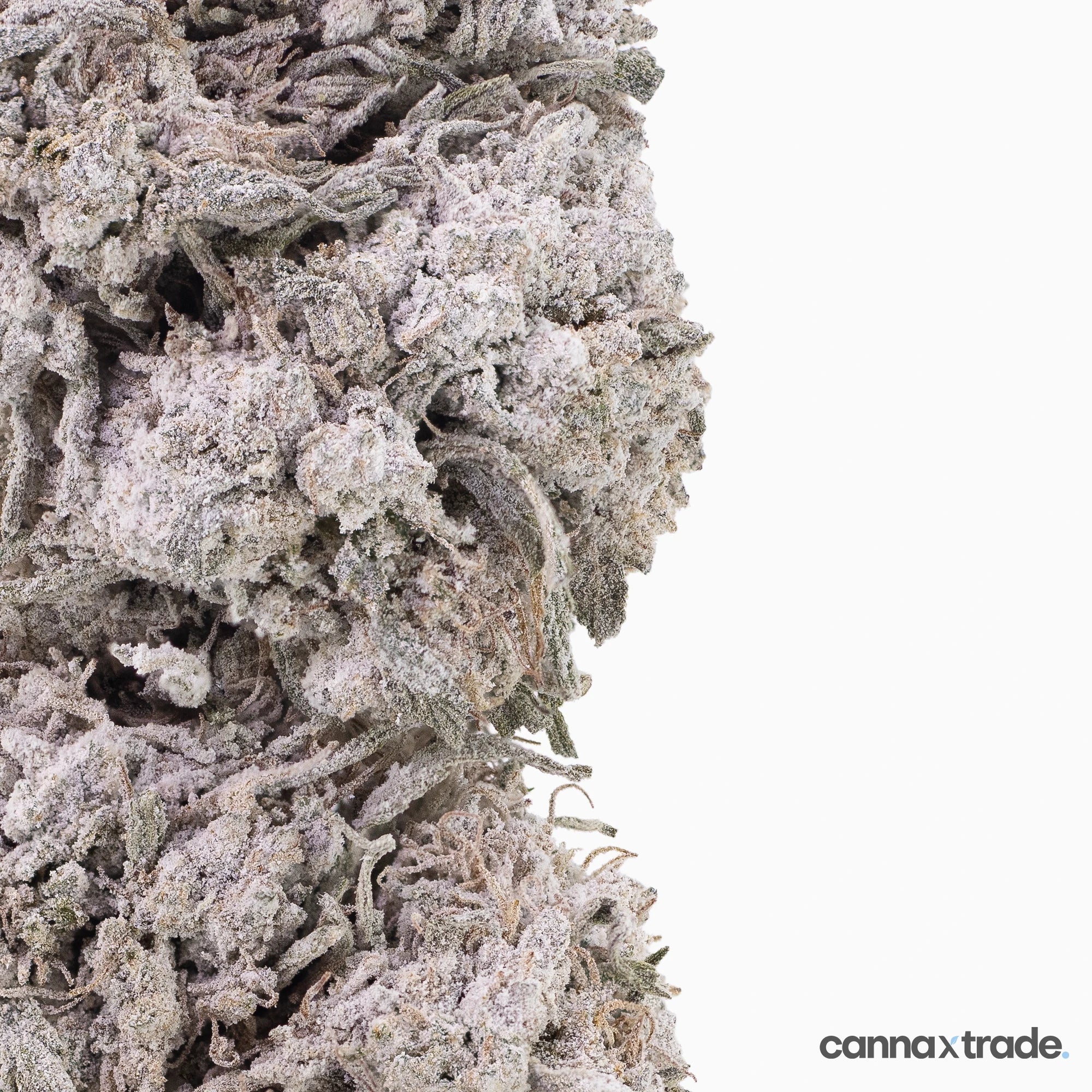 Diesel 25 is a THCA-coated, medium-dense bud with a rugged, layered structure and a pale lavender-grey coloration. The flower is heavily frosted with crystalline THCA, giving it a powdery, snow-covered appearance, while its twisted bracts and subtle muted pistils create a complex, textured finish.