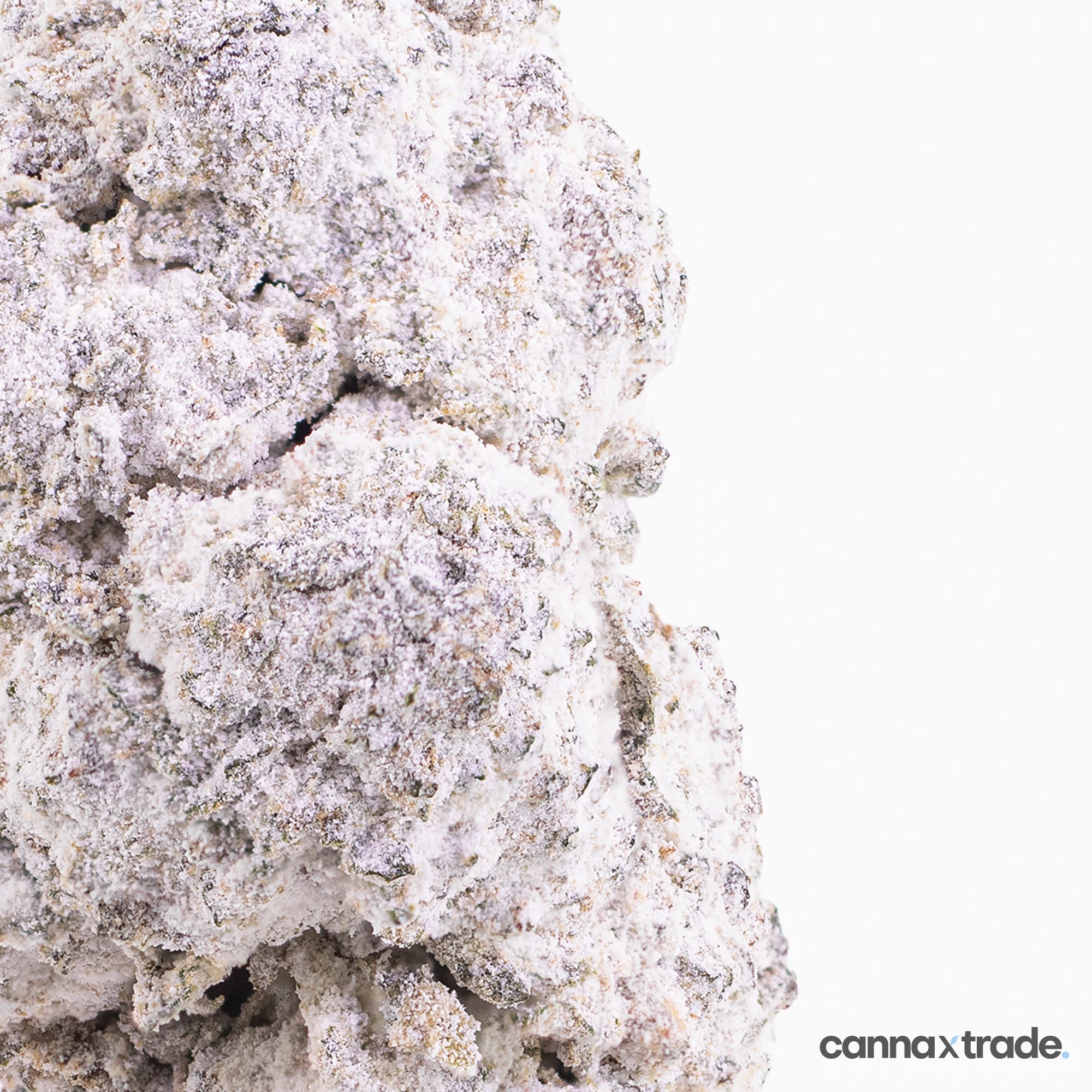 Fruit Cake 23 is a THCA-coated, medium-to-dense flower with a rounded, layered structure and a distinctly frosted aesthetic. Its surface is enveloped in an ultra-fine blanket of crystalline THCA, creating a bright, powdery-white finish that subtly mutes the bud’s natural purples and greens beneath.