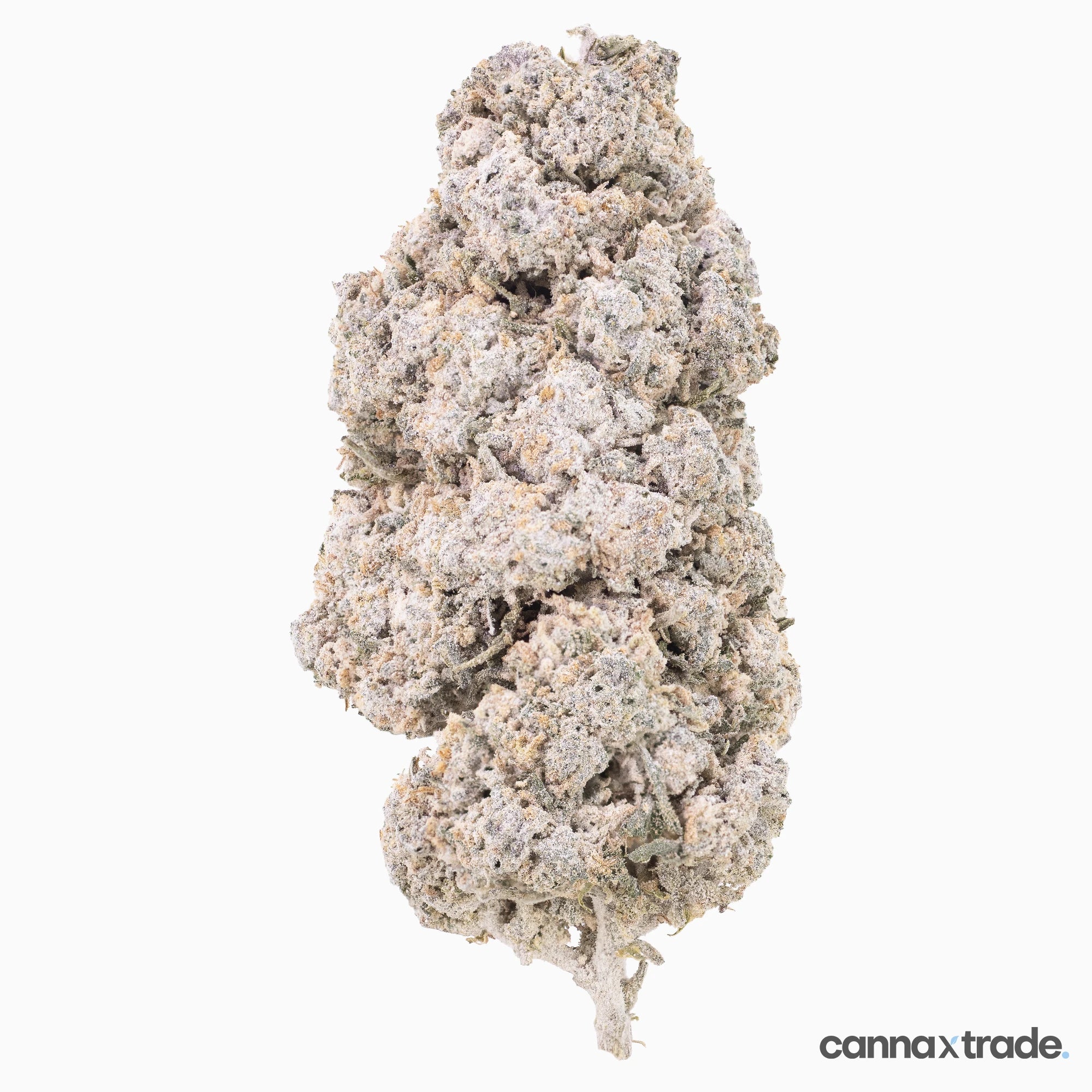 Manderine 25 is a THCA-coated, medium-dense bud with a rounded, clustered structure and a bright, frosted appearance. Its surface is heavily covered in crystalline THCA, creating a snowy white finish that contrasts with the soft orange pistils and muted green and lavender tones beneath.