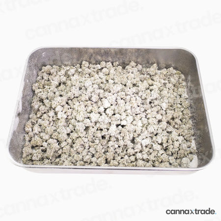 Orange Small 22 is a THCA-coated flower made up of compact, small-sized buds with a dense structure. Each nug is heavily dusted in a thick, frosty THCA layer, giving it a pale, almost snow-covered look with subtle green tones peeking through. The buds appear tightly trimmed with a gritty, crystal-rich surface that highlights the coating’s intensity.